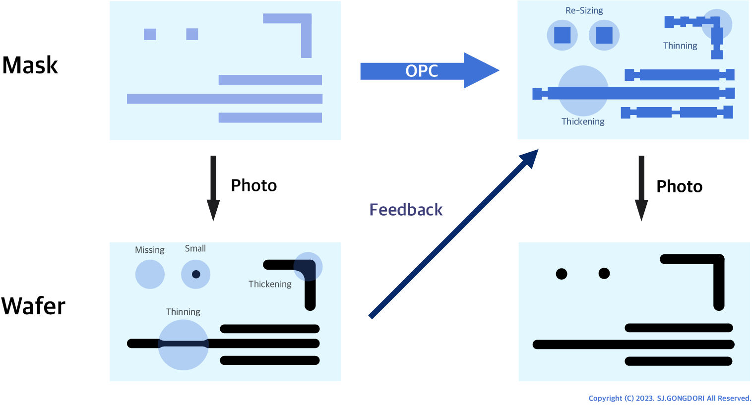 첫 번째로 회절의 간섭을 줄이는 방법은 바로 애초에 회절이 일어날 것을 예상해서 Mask의 Pattern에 반영하여 Si에 전사되는 Pattern을 구현하는 방법이다. 우리가 원하는 Pattern에서 광학적 특성을 시뮬레이션하여 Mask Pattern에 이를 미리 보정하여 반영하는 것이다. 이 방법을 우리는 OPC(Optical Proximity Correction)이라고 한다. 단순 회절의 특성뿐만 아니라 광원의 종류와 해당 Pattern에 따라 맞춤 된 Recipe를 섞어서 조금 더 완벽하게 Si에 구현할 수 있다는 장점이 있다.