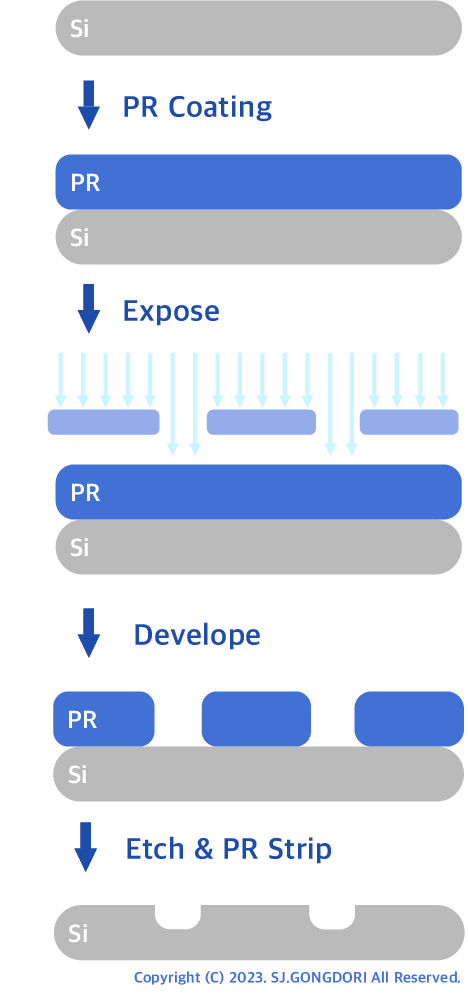 Photo Lithography 공정을 흔히 줄여서 Photo 공정이라고 지칭한다. Photo라는 명칭에서 알 수 있듯이 실제로 반도체의 Photo 공정은 사진 찍는 것과 굉장히 유사한 과정을 거친다. Mask 혹은 Reticle이라고 불리는 원하는 Patterning이 된 틀에 빛을 투과시키고 이를 다시 렌즈를 통해 축소해 Wafer 위에 도포된 PR(Photo Resist)에 조사시킨다. 이렇게 노광 된 PR은 빛과 반응을 일으켜서 우리가 원하는 Pattern의 형태로 남게 된다. 원하는 형태로 Patterning 된 PR 위에 식각 공정(Etch)을 진행하면 PR이 없는 부분만 파고들어 가면서 하부의 산화막이 우리가 원하는 Pattern의 형태로 구성하게 된다.